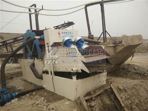 安徽宣城水洗砂生產線工藝流程:給料機+顎式破碎機+圓錐破碎機+制砂機+振動篩+螺旋洗砂機+葉輪式洗砂機,在此基礎上隆中重工為該客戶配置了雙泵型LZ-550細沙回收機一臺(如圖)。安